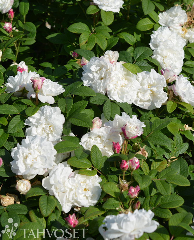 Punertavista nupuista aukeavat kookkaat, lähes valkoiset kukat. Runsaat kukkatertut, mieto tuoksu. Lähes piikitön, matalahko pensas. Tummanvihreä lehdistö. Tekee jonkin verran kiulukoita.